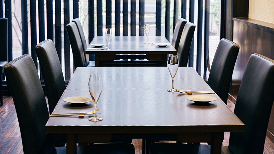 ・料理の緊張感と余白を美しく引き立てる、土壁と木の質感が調和するミニマル空間