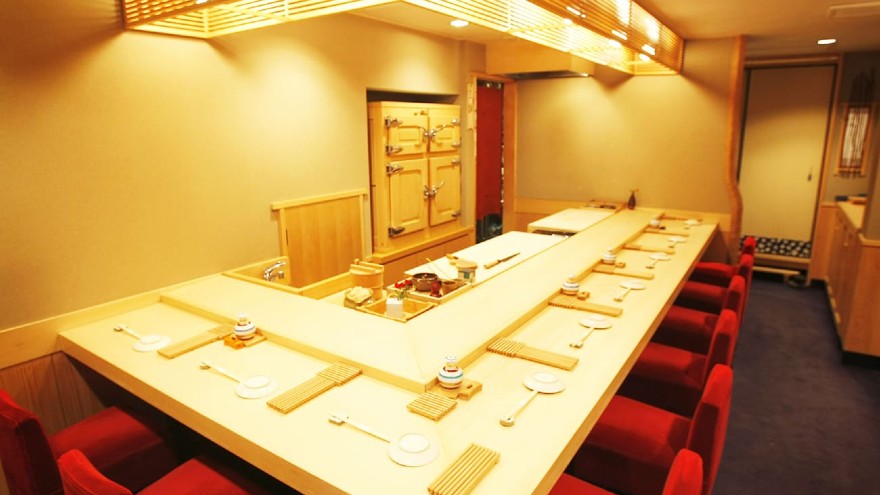 ・落ち着いた内装に構える白木のカウンターは樹齢200年、木曽桧の一枚板