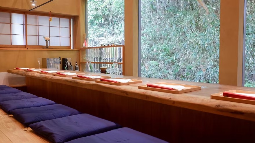 ガラス越しに季節の庭を望む空間は、清涼感と静けさに満ち、料理と真摯に向き合う時間を演出します。